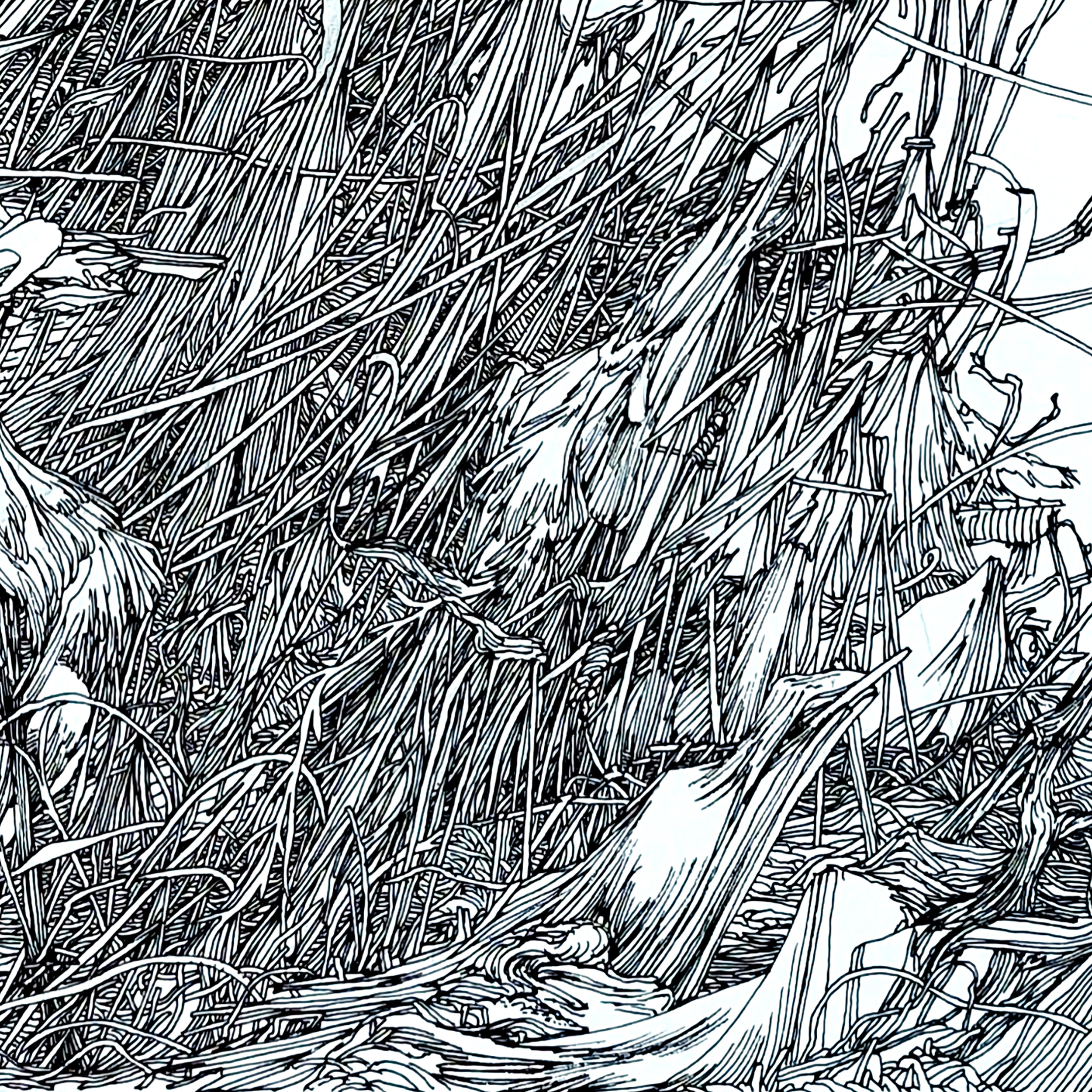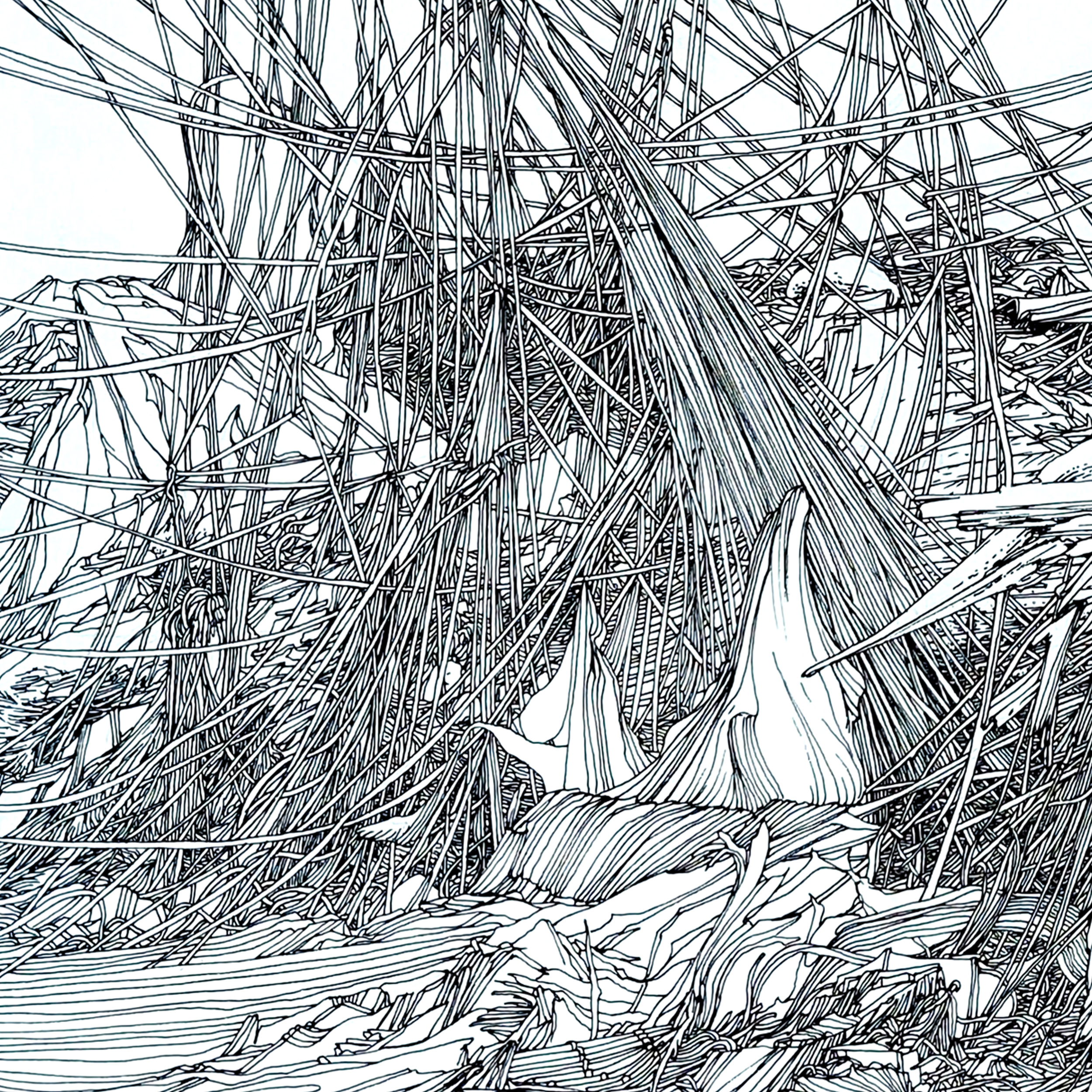 Abstract elements, with shapes reminiscent of the ropes and sails of battle ships or merchant ships, seems to have been abandoned for quite some time. Structures collapse. The wind has gone from the sails. There’s a chaotic stillness. An absurd gridlock.