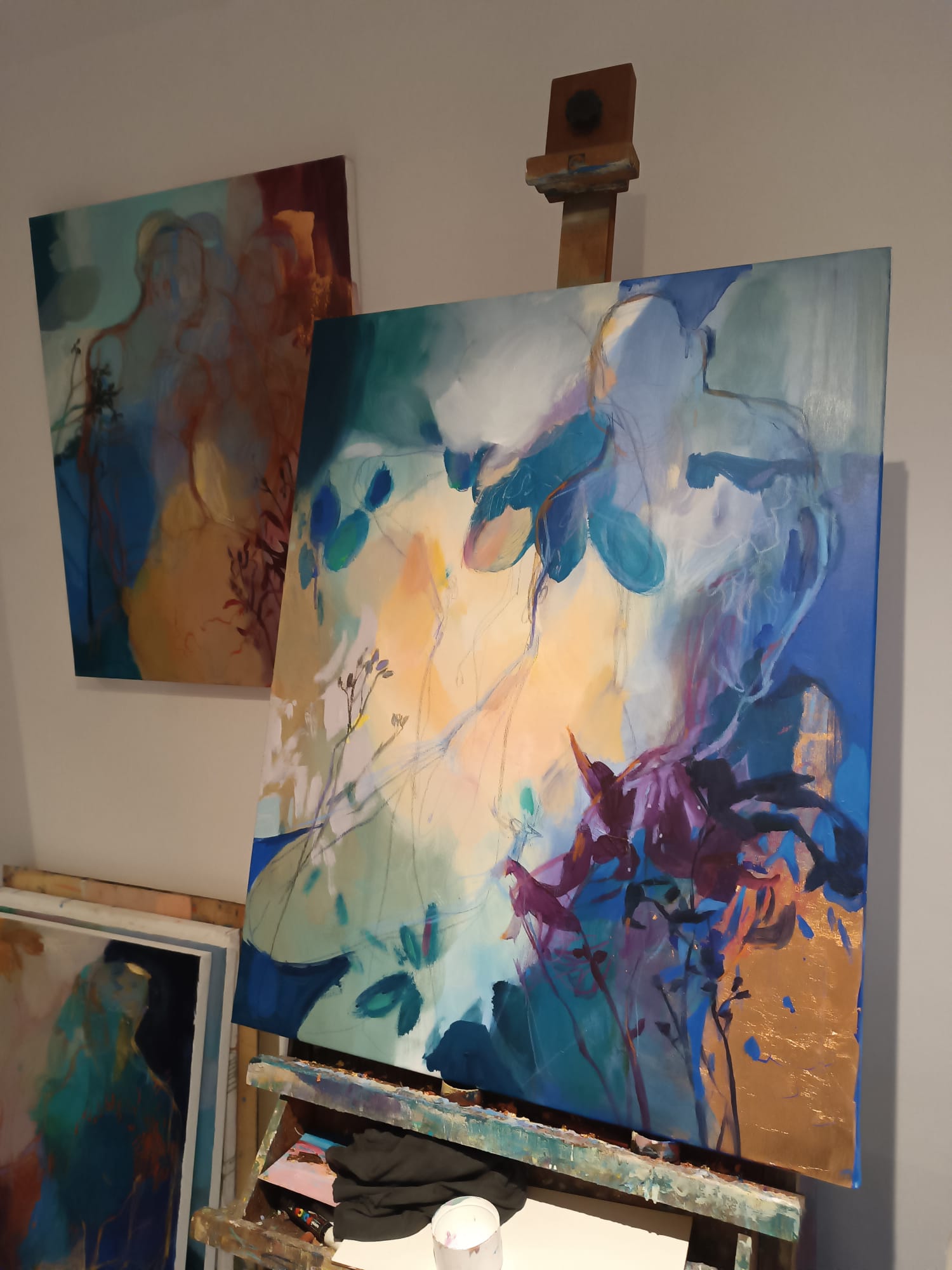 “The Quiet Bloom 1”, 2025, acrylics, pastels and gold leaf (70x90cm)